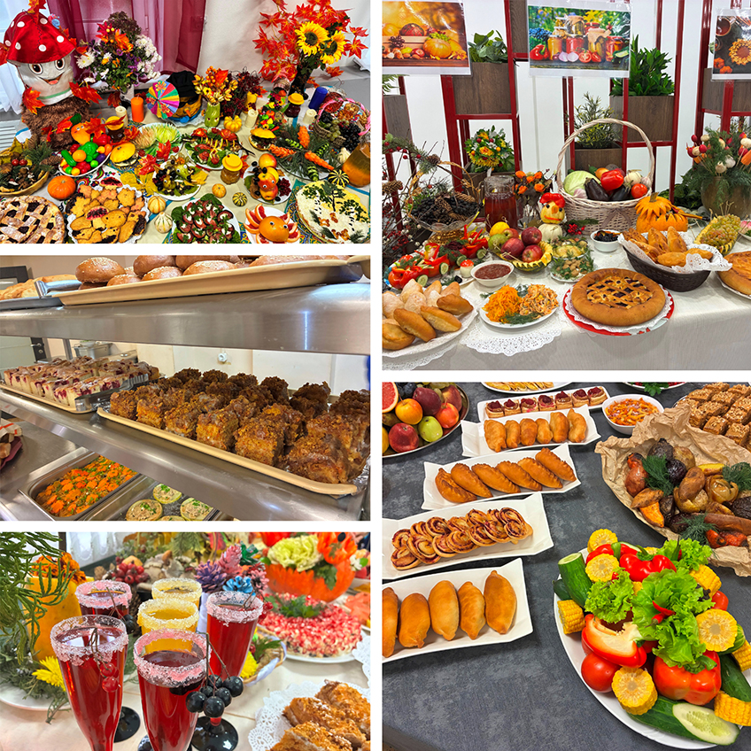 Работники комбината общественного питания предложили богатый ассортимент угощений, приготовленных из сезонных продуктов – свежих овощей, фруктов и ягод. Среди необычных блюд можно было увидеть запечённую тыкву, сладкие сорта плова, разнообразные пироги с начинкой, маринады и соленья. Каждое подразделение столовой привнесло собственный неповторимый колорит в праздничное меню. Оформление стола тоже оказалось необычным – поверхность превращалась в яркие осенние композиции, каждая деталь которых подчеркивала богатства урожая.