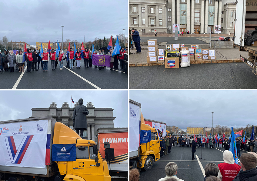 11 ноября, в преддверии Дня профсоюзов Самарской области, областная организация Профавиа и первичные профсоюзные организации АО «Салют», АО «Металлист-Самара», ПАО «Гидроавтоматика» принимали участие в акции «Солидарность». С площади им. В.В. Куйбышева состоялась очередная отправка гуманитарного конвоя в зону СВО. На мероприятии присутствовали председатель ФПСО Дмитрий Геннадьевич Колесников, заместитель командира одного из подразделений, участвующих в СВО, член Общественной палаты РФ Павел Александрович Покровский, профсоюзный актив региона. Средства личной гигиены, генераторы, радиостанции, тепловизоры и квадрокоптеры, медикаменты, строительные инструменты, расходные материалы, а также письма с теплыми и добрыми словами поддержки отправились нашим бойцам.