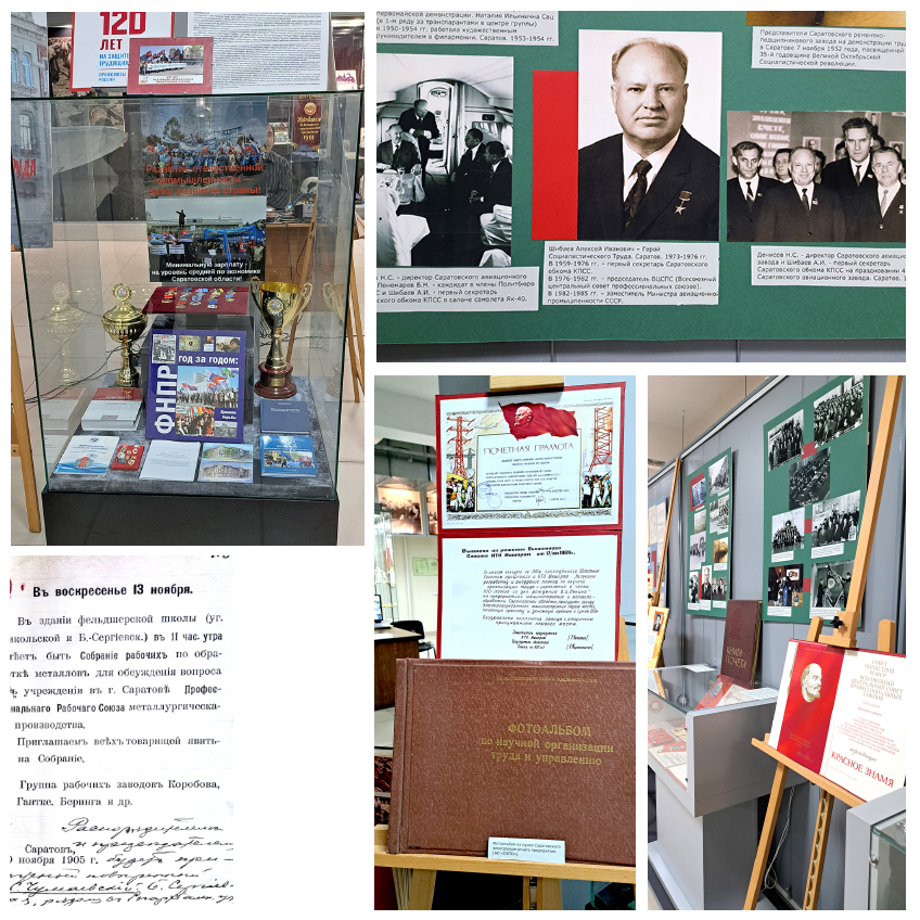 В экспозиции собраны уникальные экспонаты, отражающие становление профсоюзного движения в регионе, среди них первые заявления саратовских рабочих о проведении профсоюзных собраний, исторические фотографии первомайских шествий, материалы об участии профсоюзов в эвакуации предприятий в годы Великой Отечественной войны, лечении раненых бойцов в профсоюзных госпиталях и многое другое.