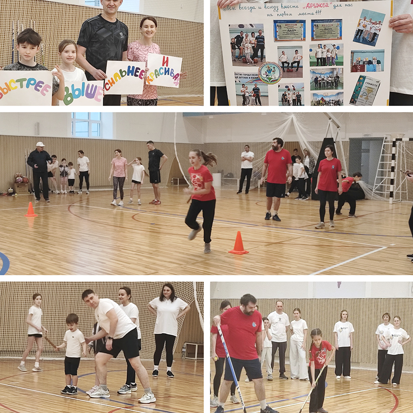 Команды «Дружба» – семья Туракалиных, «От винта» – семья Чайниковых, «Монстрики» – семья Тябиных, «Вперед» – семья Габитовых, «Абдуллин +3» – семья Абдуллиных, «Медведи» – семья Медведевых в эстафетах «Владение мячом», бег со скакалкой и «Ведение хоккейной клюшкой теннисного мяча» шли на равных. Решение о победе принималось судьями при проведении творческого конкурса «Визитка» и конкурса «Сюрприз». В конкурсе «Сюрприз» лучшей оказалась команда Тябиных «Монстрики». По сумме времени они были вторыми, но точное попадание в конкурсе «Сюрприз» дало команде право стать первыми в соревнованиях «Веселые старты».