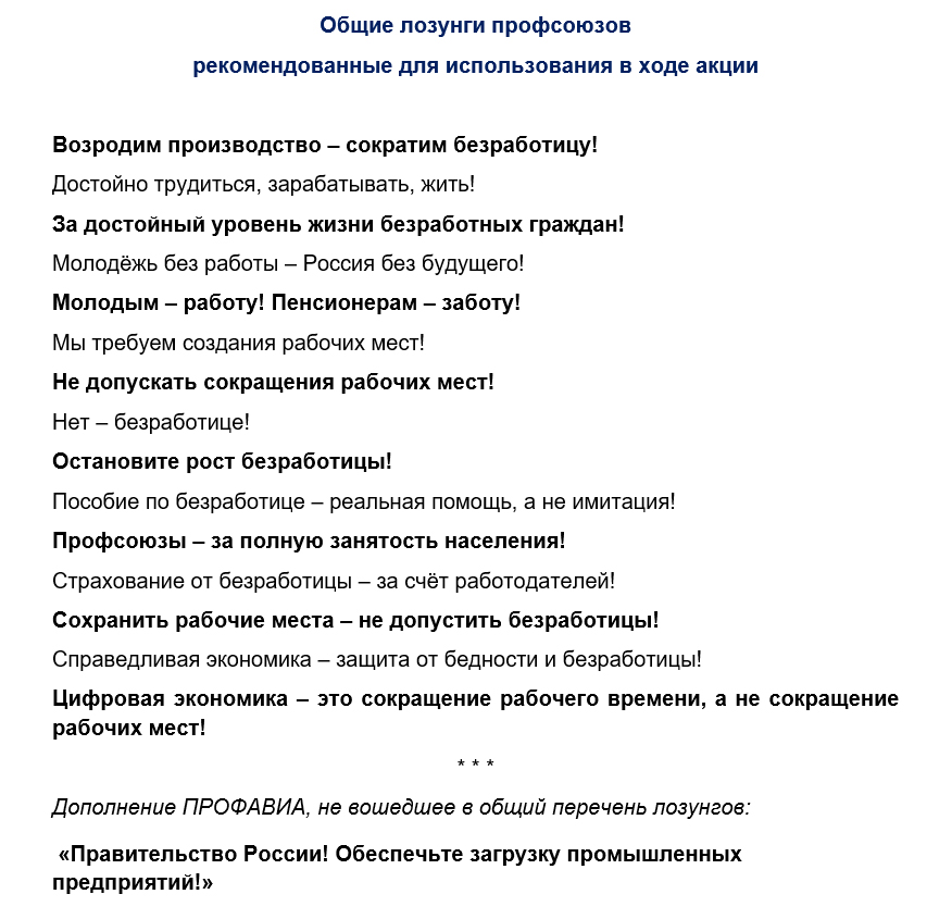 Также ККСД Профсоюза рекомендовал организациям Профсоюза использовать общие лозунги профсоюзов, а также выдвинуть дополнительные лозунги, исходя из ситуации в регионах и отрасли с учётом предложений членов профсоюзов.