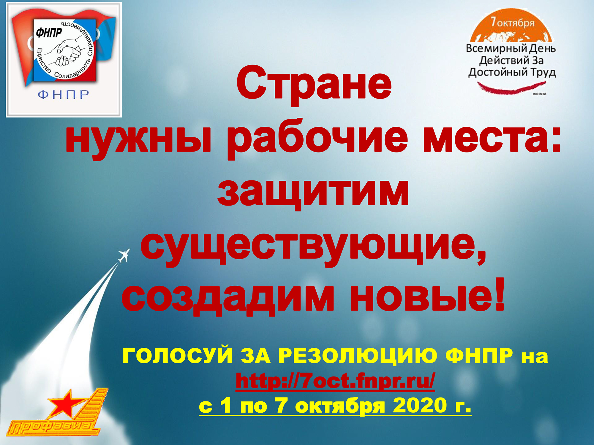 В соответствии с решением Исполкома ФНПР провести акцию с 1 по 7 октября 2020 года под девизом «Стране нужны рабочие места: Защитим существующие, создадим новые!».
